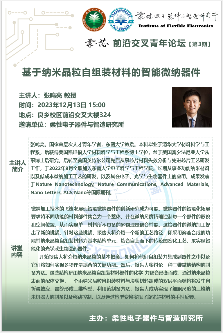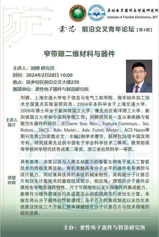 柔性电子器件与智造研究所 (Institute of Flexible Electronics, BIT)由国家杰出青年基金获得者沈国震教授组建,依托做爱视频 ,聚焦后摩尔时代微电子器件与集成电路的革命性发展方向,面向国家重大需求和国际前沿,基于柔性电子可拉伸、弯曲、折叠的形态特点,可转移、印刷的加工工艺,曲面共型、动态跟随的新应用拓展,从本征柔性低维半导体合成、工艺开发、设备研制、系统研制等方面开展系统的前沿基础与应用研究,主要方向包括:柔性光电器件与视觉芯片,柔性感知与智能机器人,仿生传感器与健康医疗,柔性多功能集成系统的设计与应用。研究所致力于打造一流的柔性电子专精特色研究平台,多学科交叉融合的公共实验平台,新型电子器件与系统集成高水平研究中心,集成电路与电子学科人才高地,未来颠覆性高精尖国防应用装备技术的研究中心,在引领该领域的学术技术前沿同时,着力培养具有精湛专业能力、思辨精神和家国情怀的新一代人才。