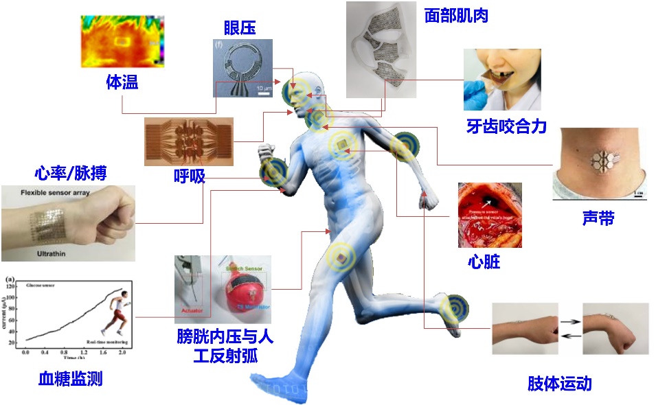 面向对人体生理健康参数的实时、精确获取与传输的精准医疗应用需求,基于柔性电子器件质量轻、形态可变、共形贴合的特点制备多功能集成的柔性传感器,在不影响人体正常活动的情况下实现对生理信号(心率、心电、呼吸、体温、血压、血氧、血糖、胎心电、汗液、脉搏)的长期动态监测,结合基因组信息、生理状况、生活习惯、个人病史、外部环境等多种因素的共同作用,对疾病进行预防、诊断与治疗。本团队在精确检测光、温度、湿度、力和汗液等多种外部刺激与生理信号的柔性传感器方面具有坚实的研究基础,基于具有不同功能的柔性传感器的多模态集成等关键技术,通过对材料体系构筑、结构设计、系统集成和信息传输方式的研究与优化,为精准医疗的实现提供技术保障。