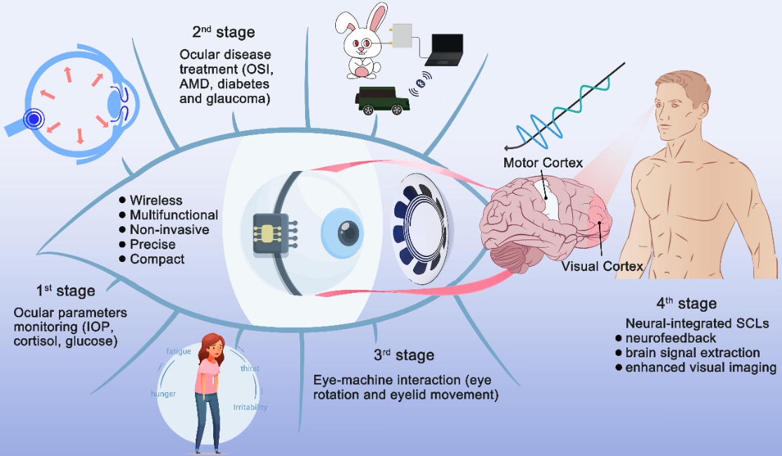 神经科学与生物医学工程领域的最新进展,极大地拓展了WSCLs的功能潜力。通过建立实时神经反馈系统,WSCLs能够将角膜电活动或微量生物标志物转化为可操作的输出,为疾病早期诊断提供了新途径。同时,WSCLs凭借其与角膜的独特接触界面,为克服传统脑-机接口的局限提供了新的可能。尽管当前WSCLs平台已取得重要突破,但其未来发展仍需在神经兼容性材料、多模态信号融合算法以及长期生物安全性等方面持续创新,以最终推动集成了神经交互能力的下一代生物电子设备的演进。