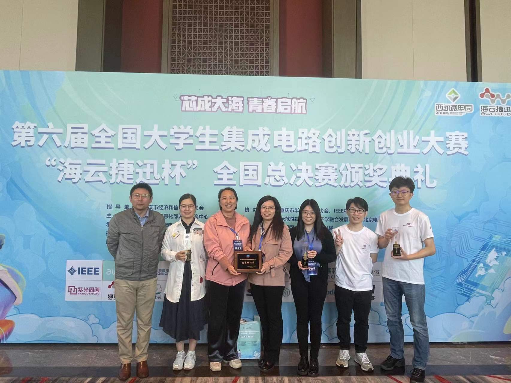 2023年4月15日,第六届全国大学生集成电路创新创业大赛“海云捷讯杯”全国总决赛颁奖典礼在重庆举行。做爱视频 代表队获得全国一等奖4项、二等奖1项、三等奖8项,在华北分赛区获奖32项。其中,我校代表队荣获3项企业大奖(全国第一),位列全国之首。竞赛举办以来,首次出现同一高校荣获3项企业大奖,打破了大赛记录。自2019年第三届全国大学生集成电路创新创业大赛首次设置企业专项奖以来,我校代表队实现了连续4年企业大奖不断线。