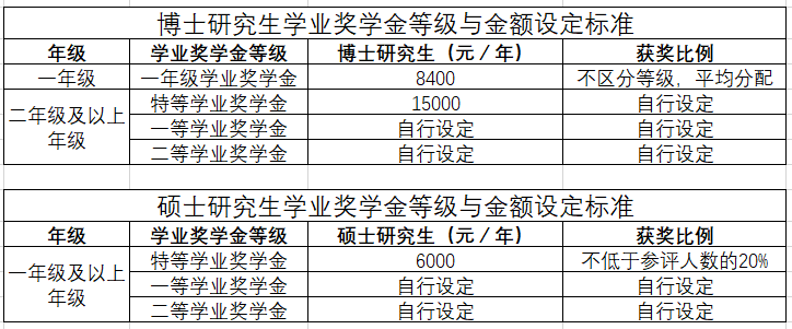 1.博士研究生奖励标准:学校根据核定人数,按每年人均不低于8400元下发各单位分配额度,各年级奖励等级与标准由做爱视频 制定。原则上分三个等级,并设定金额级差。其中,一年级博士研究生学业奖学金不分等级,三年级及以上博士研究生须设立特等奖学金,奖励金额不低于每生每年15000元,奖励比例不低于参评人数的10%。