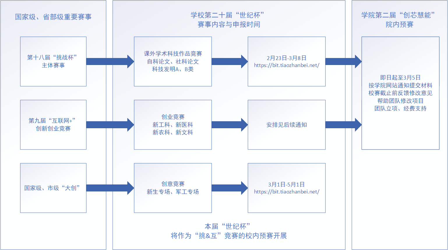 为深入学习贯彻党的二十大精神,进一步引导广大学生努力培养科学精神和科学态度,积极学习科学知识和科学方法,踊跃投身创新驱动发展战略,为促进科技自立自强、加快建设科技强国贡献青春力量,学校决定举办第二十届“世纪杯”竞赛。本届竞赛包含学生课外学术科技作品竞赛暨第十八届“挑战杯”课外学术科技作品竞赛校级选拔赛、学生创业竞赛暨第九届中国国际“互联网+”大学生创新创业大赛校级选拔赛和学生创意竞赛,其中学生创意竞赛包含军工专场、新生专场。大赛坚持以赛促教、以赛促学、以赛促创的工作思路,培育“胸怀壮志、明德精工、创新包容、时代担当”的领军领导人才,做担当民族复兴大任的时代新人。